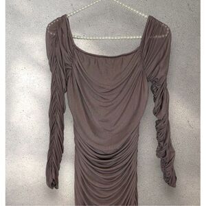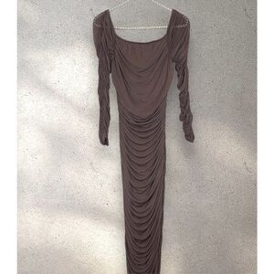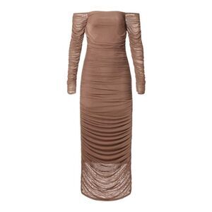 Brown jersey (95% Polyester, 5% Elastane). A-line. Long sleeves. Crewneck. Pull on. 52" from shoulder to hemline.