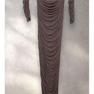 All-over ruching is here to show off your stunning shape in this off-the-shoulder gown by CAROLINE CONSTAS. Style this stunning silhouette with bold metallic accessories and a leather clutch.