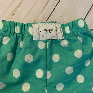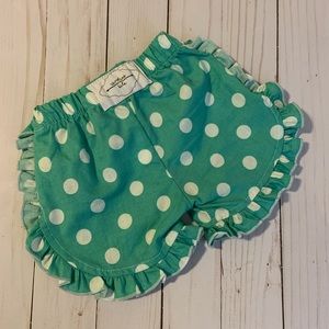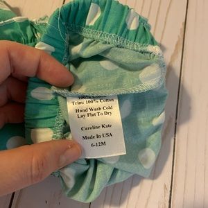 This is a pair of like new ruffle shorties/bummies by Caroline Kate. They are a teal color with white polka dots. My little wore these once for a photo. No signs of wear, no stains or tears. Size 6-12 months. These are handmade in the USA, and are such a super great quality!