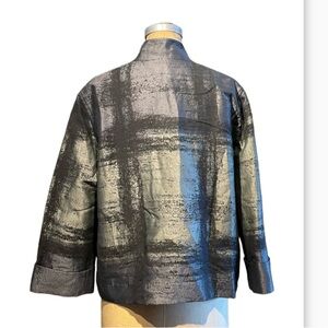 Elevate your wardrobe with this stunning Caroline Rose jacket featuring an abstract brushstroke pattern in rich tones of black, charcoal, and silvery gray. This statement piece showcases an artistic, gallery-ready design with a bold oversized button front, boxy silhouette, and wide sleeves for a dramatic yet elegant fit. Crafted from a structured, silky fabric with a subtle sheen, it brings effortless sophistication to both casual and elevated looks. Perfect for lovers of wearable art and contemporary style.