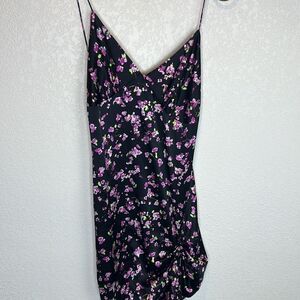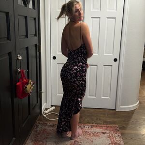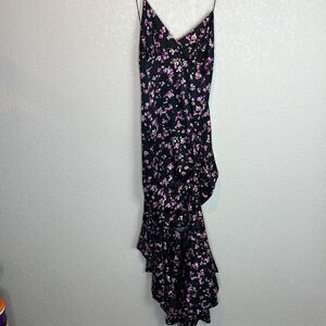 This is a showstopper!! Silk satin floral dress with a flowy asymmetrical high-low hem and ruched sides. Spaghetti straps. Surplice V-neck. Scoop back. Concealed side zipper. Unlined.