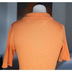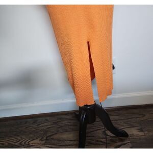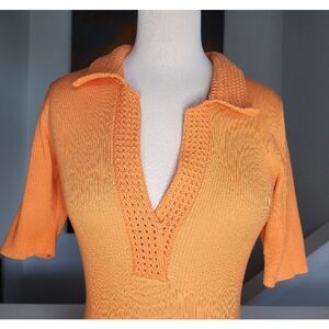 Chic orange maxi dress with a stylish knit design. Features a deep V-neck and short sleeves. Perfect for any occasion.
