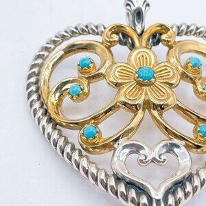 Elegant heart-shaped pendant featuring intricate floral design with turquoise accents. Crafted in sterling silver and brass for a timeless, sophisticated look.
