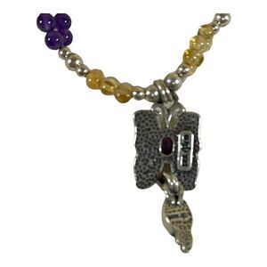 This beautiful necklace by Carolyn Pollack features a stunning butterfly pendant with a unique beaded design. The necklace is made of high-quality sterling silver and adorned with a gorgeous amethyst stone. The piece also includes a secondary garnet stone, adding a touch of elegance to the overall design.