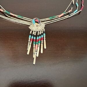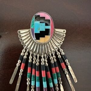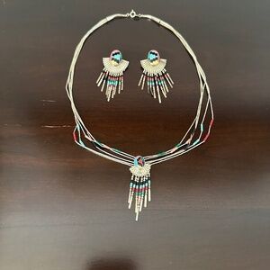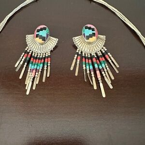 Also, 2 1/2" inch long by 1" wide inlaid beaded fringed stud earrings.