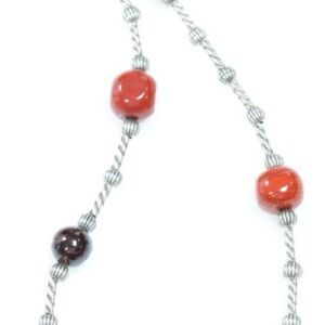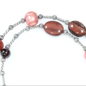 Beautiful Long beaded necklace with sterling silver long cable and bead textured links and Large Cultured Peach pearls, Carnelian, Tigers Eye and Garnet 34" long. Beads are 8mm to 17mm Pendant is gorgeous Huge Tiger eye and garnet set in lovely scrolled border large pendant. Pendant measures 2.25" x 1.25". HALLMARKED CR 925 CP.