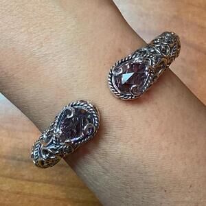 Beautiful Carolyn Pollack Vintage Sterling Silver 2 Pear Amethyst and Faceted Clear Crystal Cabochons Doublet Decorated Hinged Bracelet For Women.
