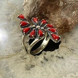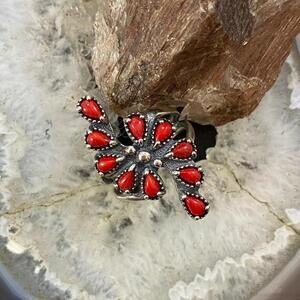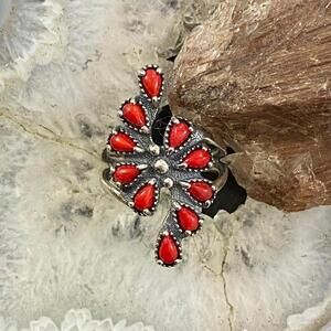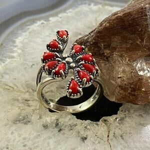Delicately Beautiful Carolyn Pollack Vintage Southwestern Style Sterling Silver 10 Pear Red Jasper Cabochons Set in Prong and Saw Tooth Bezels. The Raindrops in the Center Add to the Traditional Look of This Stunning Ring. This Design Has an Oxidized Finish With Beautiful Polished Accents.