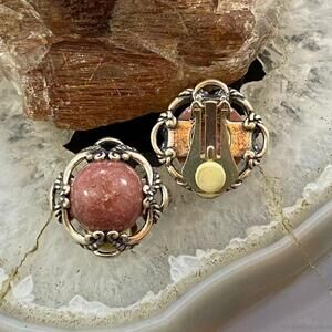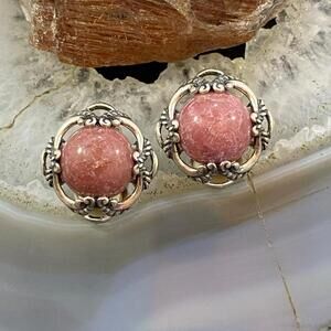 Pretty Carolyn Pollack Vintage Southwestern Style Sterling Silver Round Rhodonite Cabochon Decorated Clip-On Earrings For Women.
