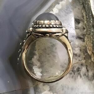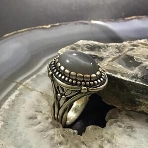 Carolyn Pollack Sterling Silver Oval Gray Agate Cabochon Decorated Split Shank Ring For Women.