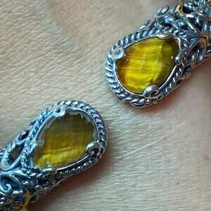 Gorgeous Carolyn Pollack Vintage Sterling Silver 2 Pear Tiger's Eye and Faceted Clear Quartz Cabochons Doublet Decorated Hinged Bracelet For Women.