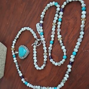 Elegant multi gemstone. 36 inch necklace featuring turquoise, pearl, rose quartz, and amethyst beads with sterling silver stations. Wear it long or double for 18 inches.