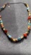 The necklace is beautifully adorned with a rich array of multi-stone beads in a warm palette. The beads feature natural colors and resemble Carnelian, Turquoise, Jade, Obsidian, and other semi-precious materials often used in this style of jewelry. The varied sizes and stone shapes enhance the organic beauty and handcrafted appeal of the design.