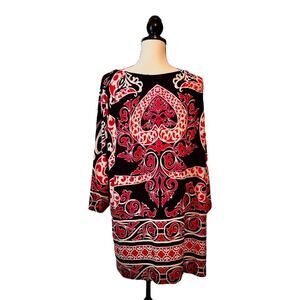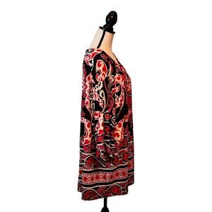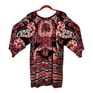 This striking cold shoulder top features a keyhole neckline secured with a stylish tie and is adorned with a bold scrollwork pattern. The relaxed fit offers both comfort and style, making it a versatile addition to any wardrobe.