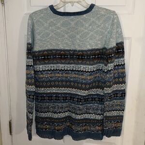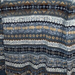 Horizontal blue, gray, brown and white design at chest level below on front and back