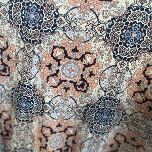 Elegant blouse with floral patterns. Features a square neckline and ruffled sleeves.