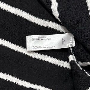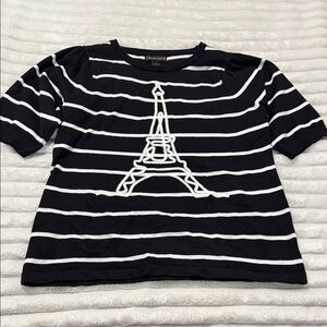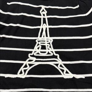 Striped black and white top featuring a stylish Eiffel Tower motif. Perfect for everyday wear.