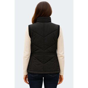 This Carolyn Taylor quilted puffer vest blends classic style with modern functionality. Featuring a warm knit trim and snap button closure, it offers comfort and versatility for cold seasons. Its sleek black design is perfect for layering, while the quality materials ensure durability. A practical yet chic wardrobe addition.