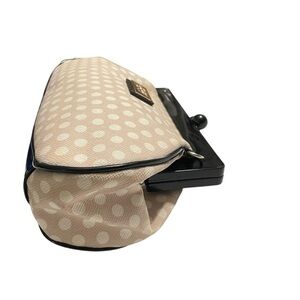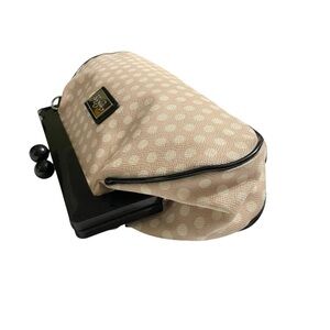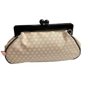 Elegant Coach clutch bag in a chic cream polka dot design. Perfect for any occasion.