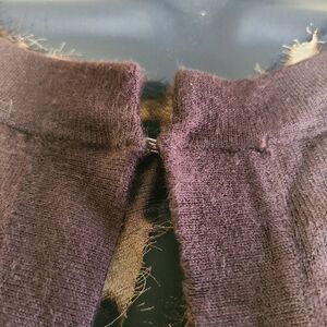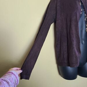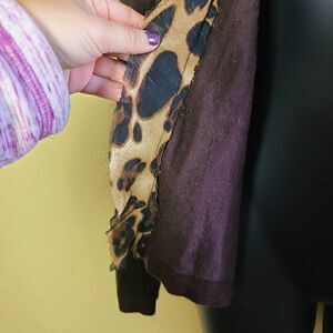 This is a long sleeved brown cardigan by Carolyn Taylor. There is animal print accent fabric inside of the cardigan and at the neckline. At the top of the cardigan is a single clasp.