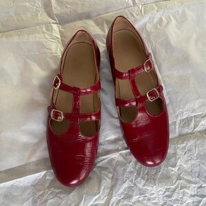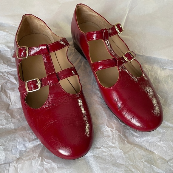 Caron Callahan Alfie flat in the most gorgeous deep red patent leather. Double t-straps that buckle. In great condition, some wear at soles and minor creasing to leather but have so much wear left. Size 37, best for a US 7 (measures 24.7cm). Similar to the Celine flats. Color no longer available, retail for $395