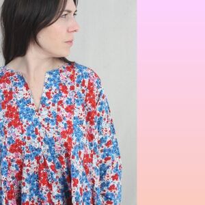 The Aria Dress is paneled, subtly pleated with a full skirt and the hem hitting just above the knee. Made in lightweight poplin florals, the Aria Dress is ideal for layering going into the warmer months. Features 3/4 length sleeves, and side seam pockets. Shorter than our typical dress, Aria can be styled over pants or worn on its own.