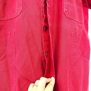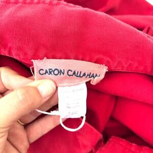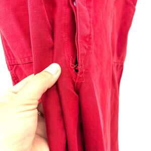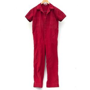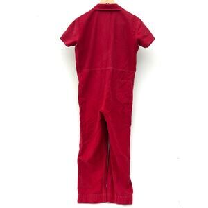 Vibrant red Caron Callahan jumpsuit crafted from sturdy cotton denim with a modern boilersuit shape. Features a crisp collared neckline, short sleeves, and an easy straight-leg fit for an elevated workwear look. Minimalist, artful, and functional—perfect for fans of contemporary designer utility pieces. Small tear at the lower button area reflected in condition. A standout one-piece ideal for casual, creative, or street-style outfits.