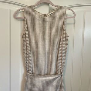 A soft and beautiful summer dress, the Marianne Dress from Caron Callahan is a sleeveless shift with apron detail that can be tied and wrapped around in multiple variations. Cut in a lightweight cotton with a natural gentle wrinkle with a round neckline, button-down closure along back, self-tie panel at hip/waist, hem hits below the knee. This colour way is black/cream.