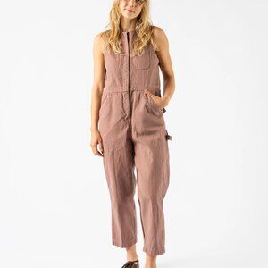 Caron Callahan Tobias Jumpsuit in Cream Canvas. Sleeveless zip-front jumpsuit with a hidden placket. Features two front-side slit pockets and four patch pockets. The Tobias has a slim fit through the cross-chest, straight through the waist, and a long back rise for an extra generous bottom fit. With plenty of room in the leg and crotch, the Tobias Jumpsuit is perfect for work and play. See third photo for fit.