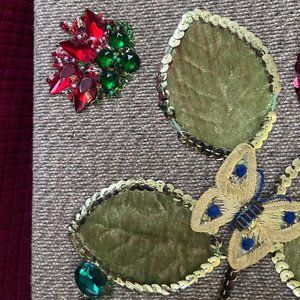 This is a Beautiful vintage handbag "Hand Decorated by Caron of Houston, TX", and is a great treasure for any collection. Perfect for a cocktail party! It is an oatmeal colored fabric with red velvet, Sequins, jeweled/beaded flowers, butterfly and apple design along with mid length handles and gold hardware. There is some ware to the fabric in the bottom right corner and a small stain on the back, otherwise clean from a smoke-free environment. It has 1 ample compartment with a side zipper pocket.