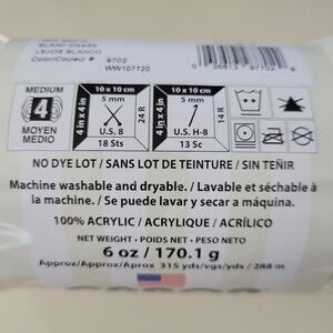 Wrap yourself in comfort and luxury with this ever-popular soft yarn. The weight, luster and sheen of this yarn simply has no equal. In knit or crochet, the drape of Simply Soft makes it the right choice for garments and throws alike. A premium yarn that delivers on the details—no dye lot solids plus machine washable and dryable. NWT
