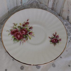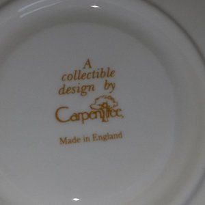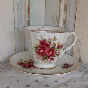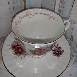 This cup and saucer are made by Carpentree in England. This is a beautiful floral rose design with gold trim on both pieces. The top inside rim reads, May God Bless You And Keep You, in gold lettering. The plate measures 5 5/8" across and the cup is 3" tall by 4" across including the handle. This set is in wonderful condition!