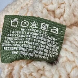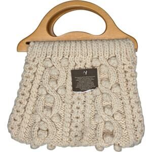 Cable knit 100% wool small bag with light wood double handles.