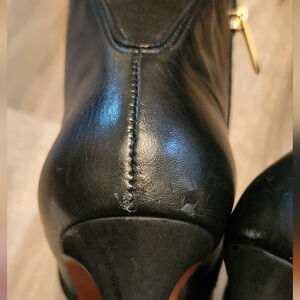 Gold zipper pull, minor scuffs at toes and heels. Wear on soles, some wrinkles in leather, no peeling, scratches or tears.