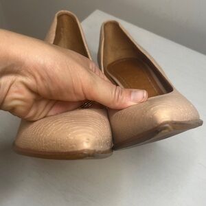 Light pink snakeskin embossed roach stompers (as my mother called them) with a beautiful stacked heel and cushioned footbed. Very light wear to exterior, a few faint discolorations and scuffs to heel. See pix for full description.