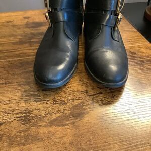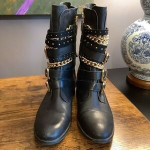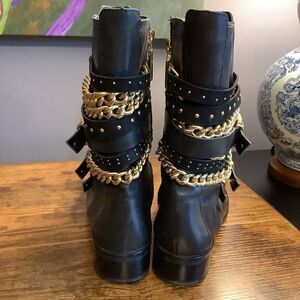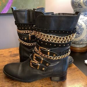 Rich, supple, black leather Moto style boots with gold chain and black suede details. Made in Brazil. Gorgeous! Size 6.