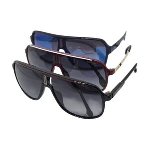 Set of Carrera aviator sunglasses in blue, brown, and black. Stylish and versatile.