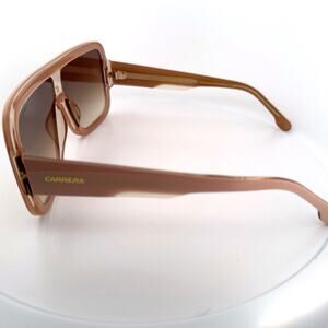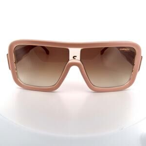 Sleek and modern, these Carrera Ducati Collection sunglasses combine performance design with Italian luxury style. The bold oversized visor silhouette features a matte nude-pink frame, gold-tone bridge accent, and brown gradient lenses offering UV protection. A perfect statement piece that blends sport and fashion seamlessly.