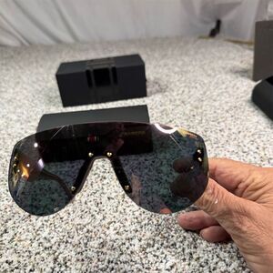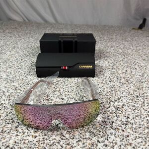 Elevate your style with Carrera's Unisex Shield Sunglasses, a bold statement piece for those who dare to stand out. Featuring a multicolor plastic frame and oversized design, these sunglasses offer a modern twist on a classic look. The mirrored pink lenses not only add a pop of color but also provide UV400 protection, ensuring your eyes are shielded from harmful rays. Perfect for any adventure, these sunglasses blend fashion with function. This pre-owned pair is ready to accompany you on your next journey, offering both style and protection.