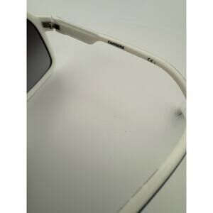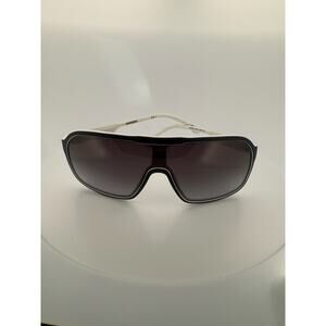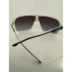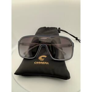 Carrera shield-style sunglasses with bold wraparound frames in black and white detailing. Featuring gray gradient lenses and Carrera branding across the top bar, these sunglasses combine sporty performance with streetwear style.
