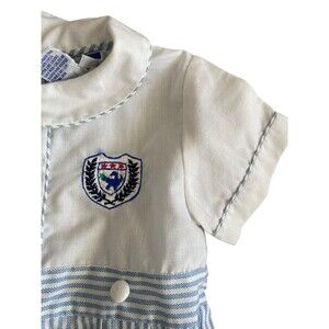 Adorable Carriage Boutiques baby boy romper in blue/white stripes, size 12M. Features embroidered crest, Peter Pan collar, fabric-covered buttons, and pleated legs with elastic hems. Pre-owned and in great condition with no stains or holes.