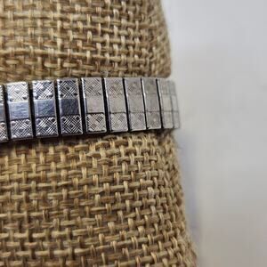 Carriage by Timex ladies watch wristwatch, patterned silver tone metal stretch band, round face, white with silver tone numbers and stick indices, seconds hand, 30 meter water resistant.
