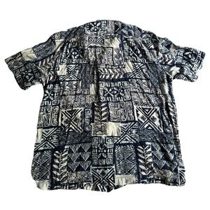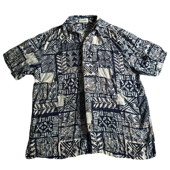 Carribean Silk Blend Hawaiian Shirt Mens L Blue White Geometric Beach Button Up