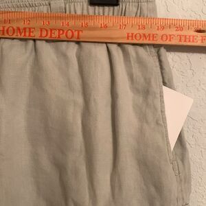 Comfortable and stylish tan cargo shorts perfect for casual outings. 100% linen. Features multiple pockets for convenience.
