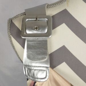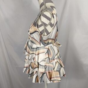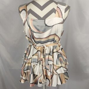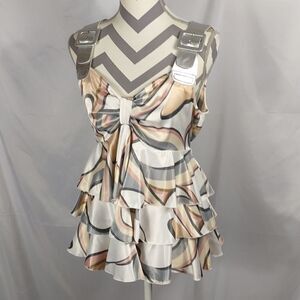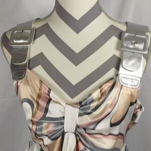 This cream, gray and mauve sleeveless Carrie Allen ruffled blouse is a size Large with a pit to pit measuring 19". It ties in the back and has two silver metallic buckle straps. 97% polyester 3% spandex and machine washable. Pre-owned and in like new condition. All offers welcome.