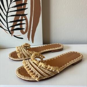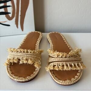 Carrie Forbes woven raffia "Mars" slide sandals with fringe trim. Neutral beige color. Vacation sandals perfect for the beach or pool. Size EU 40, may fit a U.S. size 10.