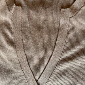 83% rayon, 15% nylon, 2% spandex. Made in China. Hand wash. Partial front button closures. Lightweight ribbed knit fabric. Micro-ribbed hem.