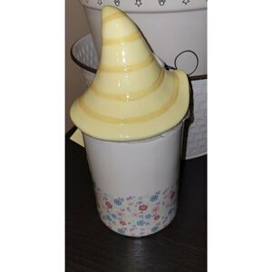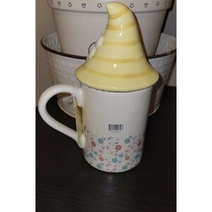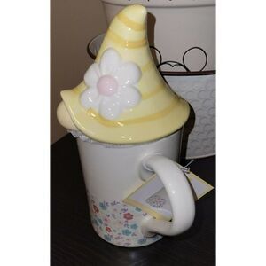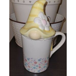Carrot Patch Cottage flower coffee mug with a yellow hat gnome topper. Hand wash only. Item is new with tag.