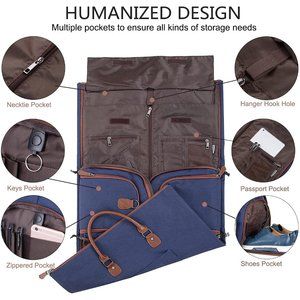 -✅SUPER VERSATILE BAG: With the fancy design of combining the feature of garment bag and duffel bag, such as hanging clothes, various internal pockets (placed with tie, umbrella, wallet, mobile phone, etc.) and large capacity. On the side of the leather garment bag, there is a zip pocket for easy access to electronics or travel materials.