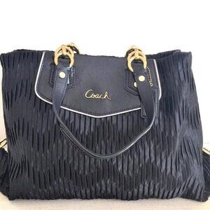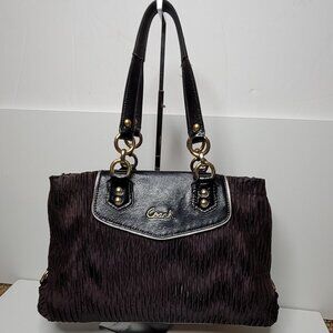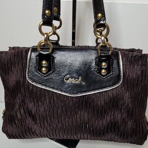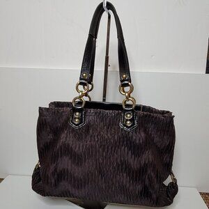 This black Ashley Carryall is constructed of gathered satin material with patent leather trim. It has brass hardware, dual shoulder straps and is very spacious to carry your essentials. Measures: 15" L x 10" H. Strap drop is approximately 8 inches. gently used and clean inside and out, see the last few photos for the flows on the edges, and on the front, the handles has some wear and faded color.